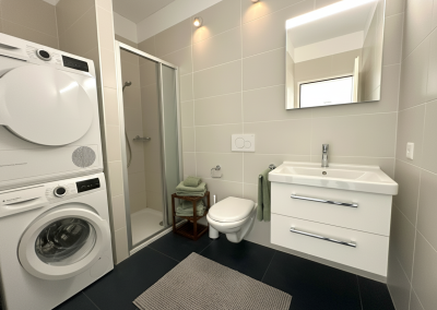 La zona notte comprende un bagno con box doccia e colonna lava-asciuga, la camera matrimoniale con bagno en suite dotato di vasca, e una seconda camera versatile, perfetta per figli, ospiti o come uso studio.
