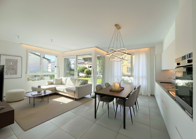 La zona giorno si affaccia sul portico coperto e sul giardino ad uso esclusivo, curato e pianeggiante, che circonda l’appartamento su tutti i lati, il quale garantisce privacy e affaccio sul verde.