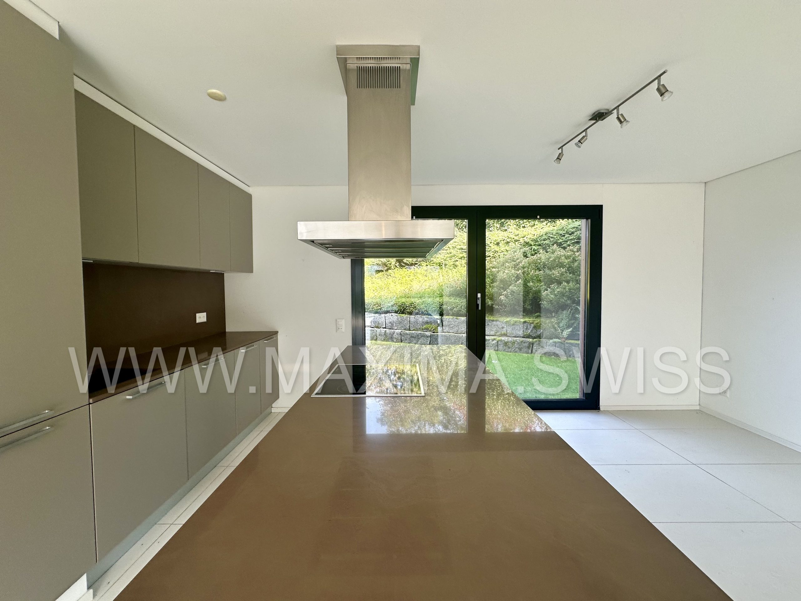 Cucina open space con isola, dotata di elettrodomestici Miele, con accesso diretto al curato giardino pianeggiante.
